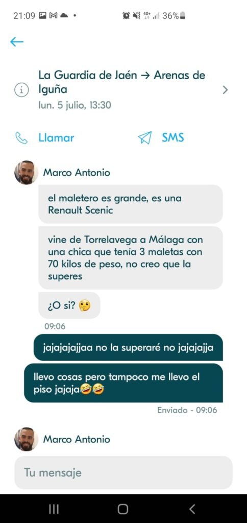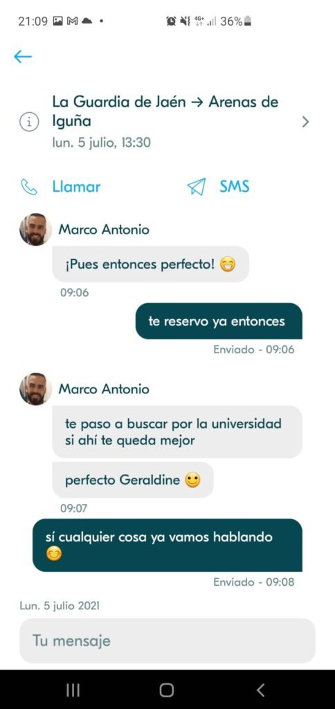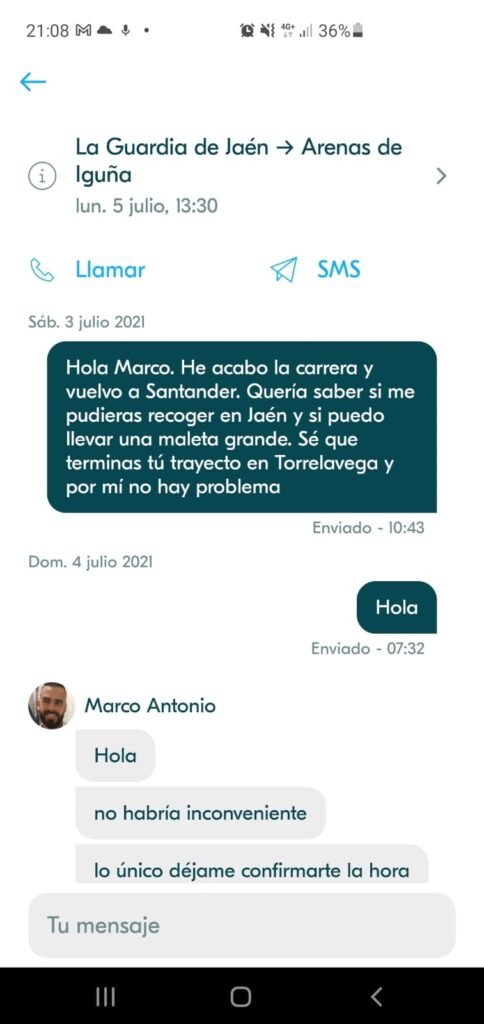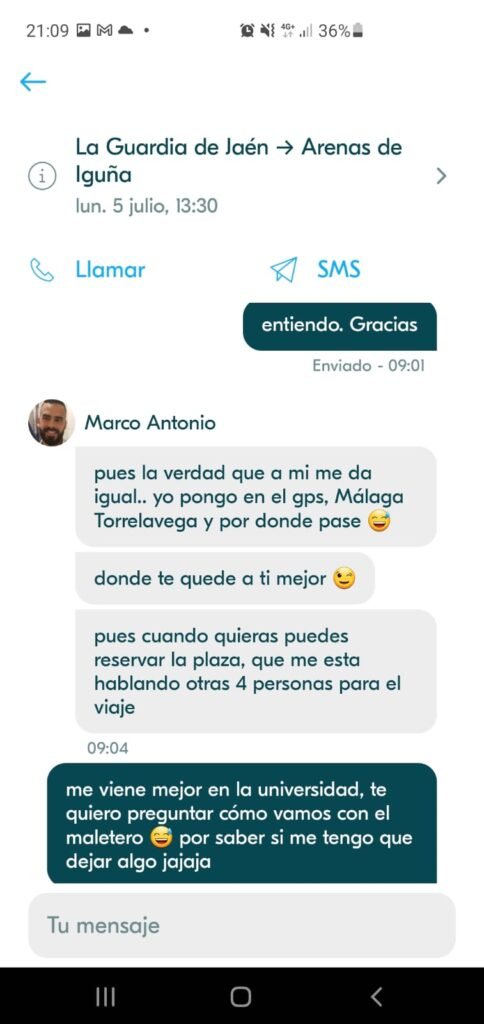 A pocos días de dejar el alquiler de mi último piso en Jaén, ya que estaba por concluir mi carrera y regresar por fin a casa (Santander), se me hacía difícil encontrar a alguien que pudiera llevarme directamente y con todo mi equipaje. ¡Ya no sabía qué hacer! Sin mucha esperanza, un día antes del viaje apareció una opción en BlaBlaCar… ¡No lo podía creer!